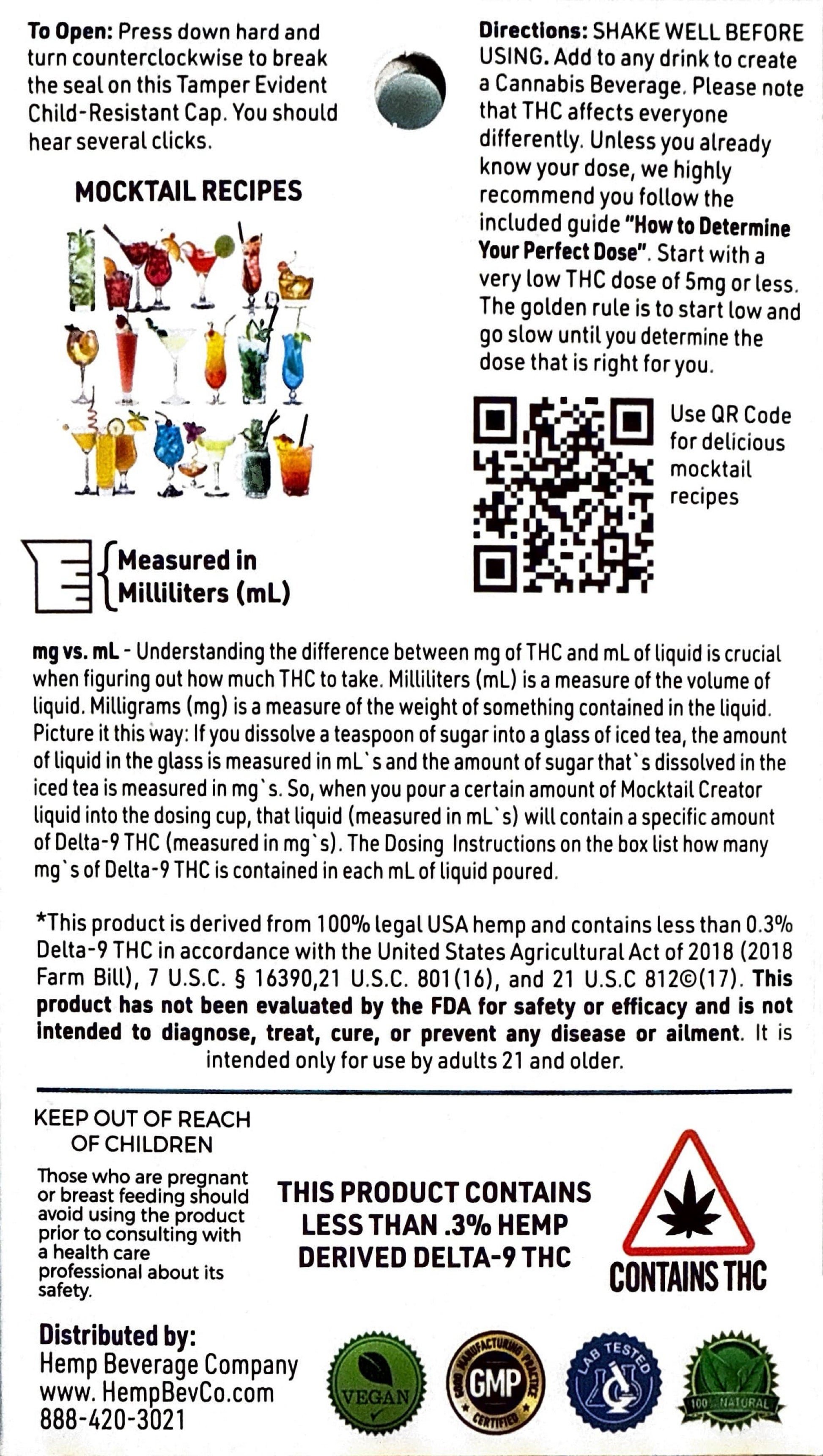 Make any drink a cannabis beverage Mocktail Creator transforms any drink into a delicious and refreshing cannabis mocktail. With 100mg of THC per bottle, it provides 20 (5mg) servings, making it the ideal choice for crafting libations with friends or indulging in your own personal pleasure. Experience the wonders of cannabis without the drawbacks of inhaling smoke or nursing an alcohol-induced hangover.